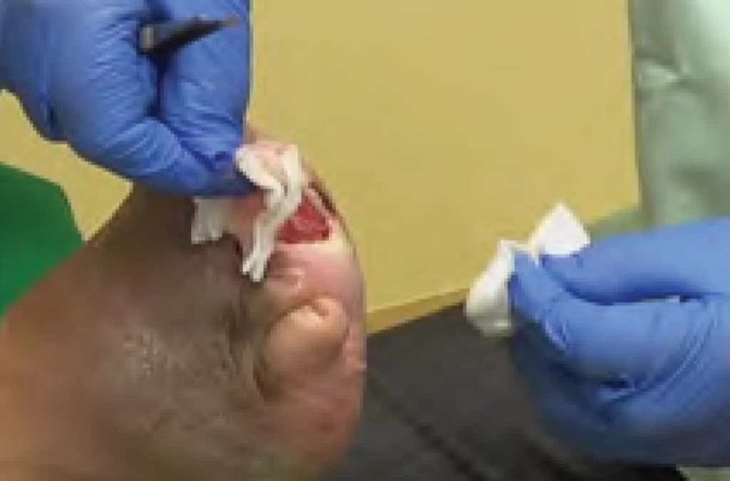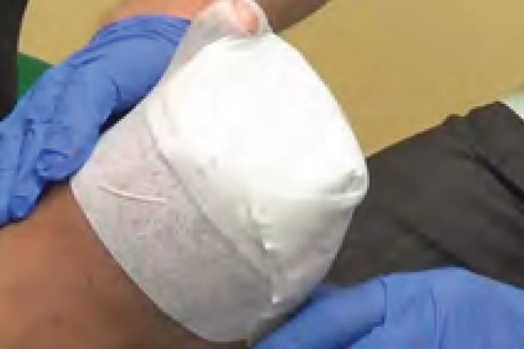Moisten wound with saline or antimicrobial