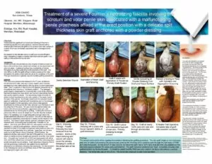 Treatment of a severe Fournier's necrotizing fasciitis involving the scrotum and volar penile skin associated with a malfunctioning penile prosthesis affixed in the erect position with a delicate split thickness skin graft anchored with a powder dressing