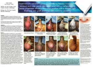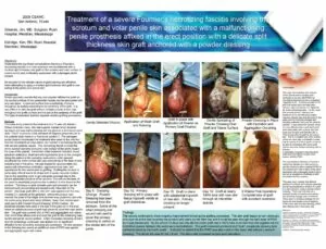 Treatment of a severe Fournier's necrotizing fasciitis involving the scrotum and volar penile skin associated with a malfunctioning penile prosthesis affixed in the erect position with a delicate split thickness skin graft anchored with a powder dressing